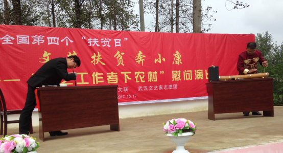 为纪念全国第四个“扶贫日”,营造人人关心扶贫、人人参与扶贫的社会氛围,10月19日上午,武汉市文联、武汉文艺家志愿团一行40余人满怀激情,来到了蔡甸区消泗乡洪南村,举办了“文艺扶贫奔小康——‘文艺工作者下农村’慰问演出”活动。