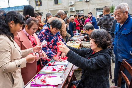 在精彩的演出之外,张露文、彭艳华、林君、崔萍、陈国辉、罗琦等众多民间艺术家还现场进行了民间工艺展示展演,手把手辅导村民制作剪纸、手绘团扇、面人、香包、中国结、丝网花、蛋雕等民间手工艺品。热心的村民将几位民间艺术家团团围住,认真地观看并学习民间手工艺品的制作。几位民间艺术家制成的团扇、剪纸、中国结等精美作品,更是被积极的村民们“一抢而空”。