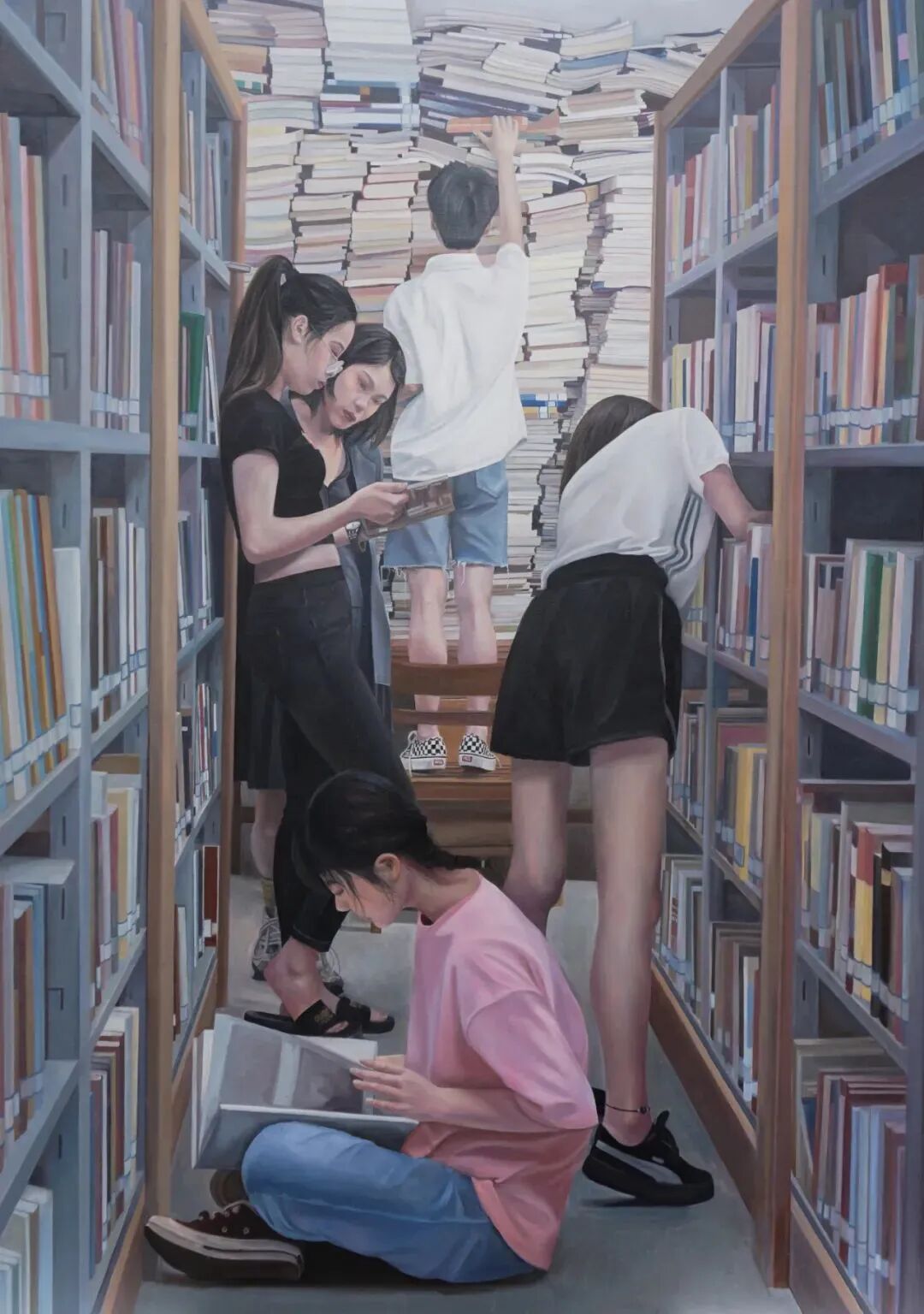 作品简介:该作品由青年艺术家杨新宇创作。作者走近青年群体进行采风创作,以新时代正青春的年轻学子们为题材,选取图书馆的一隅,将人物融入“书海”。画面呈纵深状构图,作者对青年们积极认真、敏思好学的阅读场景进行了细致描绘,层次分明,寓意明确,以细腻的视角展现出青年们朝气蓬勃、奋发图强的姿态,也折射出“少年强,则中国强”的勃勃气象。