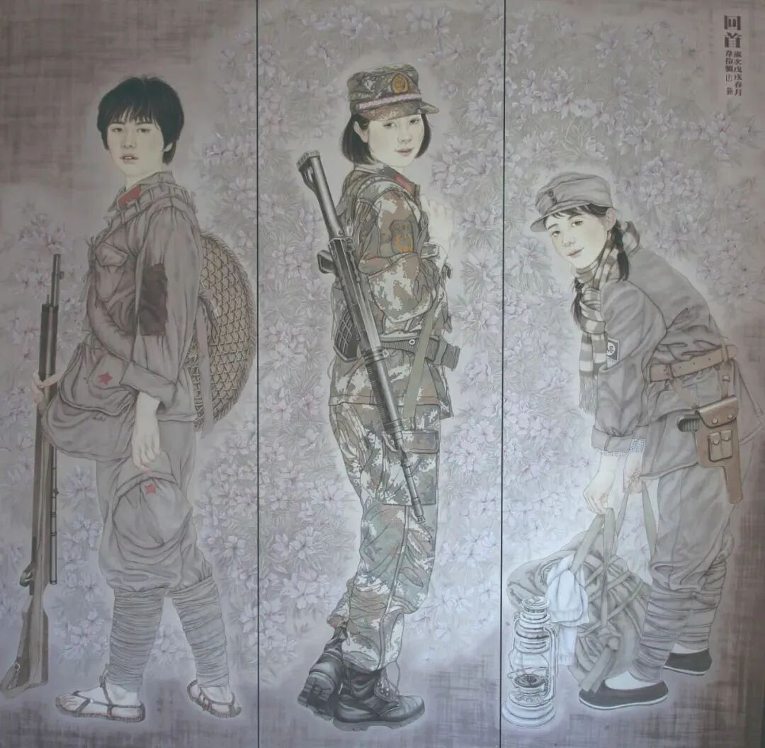 作品简介:该作品由湖北美术学院教师韦伶创作。作品以女性视角,细致入微地刻画了红军、八路军和现代军人三种不同形象女战士的回首瞬间,背景以浪漫主义手法大面积铺以映山红,烘托出我军建军以来各时期女战士的芳华和风采,隐喻了女战士在艰苦的战争岁月中坚守理想信仰、奉献青春、不忘初心、不怕牺牲、不畏艰险的革命精神与崇高的革命理想。作品在人物的刻画上既突出了女战士豆蔻年华的柔美,又体现了她们对国家的热爱和对革命理想信念的执着追求。作品以“回首”的瞬间塑造人物形象并命名,寓意勿忘历史,传承了爱国主义精神。