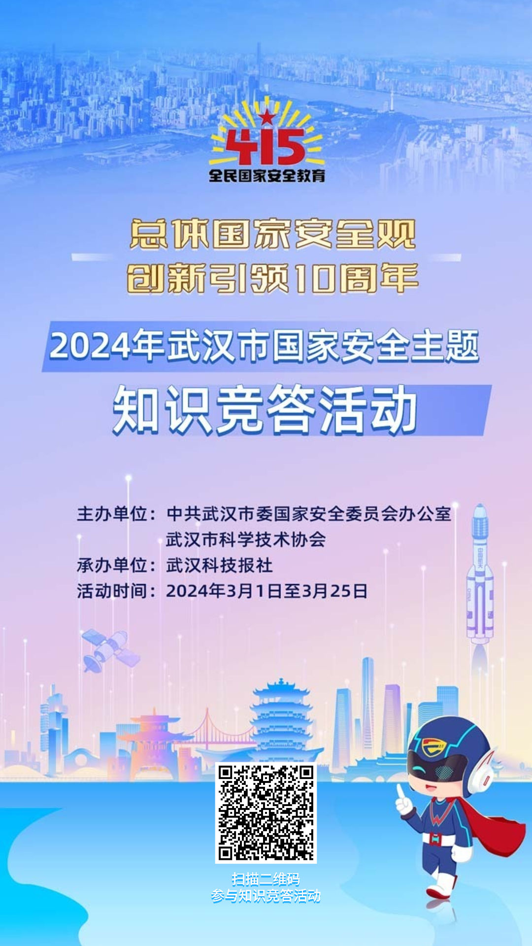 今年是习近平总书记创造性提出总体国家安全观10周年,4月15日是第九个全民国家安全教育日。为全面宣传贯彻总体国家安全观,不断增强全民国家安全意识和素养,营造浓厚的国家安全宣传学习氛围,由中共武汉市委国家安全委员会办公室、武汉市科学技术协会主办,武汉科技报社承办的2024年武汉市国家安全主题知识竞答活动将于3月1日正式启动。