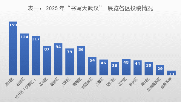 在武汉书协的统一部署下,武汉地区各区级书法协会积极行动,广泛动员。从各区投稿人数排名来看,洪山区、武昌区、经开区(汉南区)位列前三,分别是159件、124件和117件。洪山区、武昌区、江岸区等书法强区依然保持了较高的投稿热情和参与度,投稿人数位居前列。