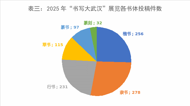 此届展览根据征稿标准,进入评审阶段的有效作品1009件。根据各书体的投稿量显示,隶书作品投稿量最大,占比27.5%,这与刚刚结束的全国第五届隶书展征稿密不可分,也体现了武汉书协工作引导的精准性;楷书256件,占比25.3%,依旧是武汉书家投稿的强项;行草书紧跟其后,分别是231件和115件,占比22.8%、11.3%;篆书97件,占比9.6%;篆刻作品今年投稿量有所下降,只有32件,占比3.1%。