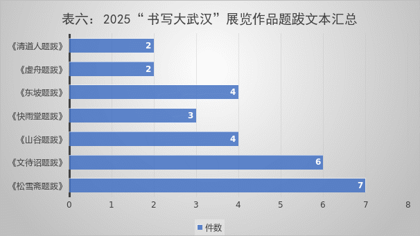 不同名家的题跋内容是各层次展览作品中的创作“常客”,重复雷同现象时有发生。这次内容为不同题跋的作品主要集中在楷书和行草书,且基本为小字多量作品。有赵孟頫《松雪斋题跋》7件;文征明《文待诏题跋》6件;黄庭坚《山谷题跋》4件;苏轼《东坡题跋》4件;王文治《快雨堂题跋》3件;王澍《虚舟题跋》2件;李瑞清《清道人题跋》2件。这一现象表明,在当前书法创作环境中,一方面,古代名家短小精悍的题跋内容可以配合行草书的章法变化,满足大篇幅、多内容的现实需要;另一方面,过度集中于少数名家题跋,暴露出书家们在创作上存在一定的局限性和依赖性,导致新的“俗化”内容产生,使书法创作陷入内容同质化的困境。书家要持续挖掘更为广泛文本资源,拓宽创作视野,以推动书法艺术的繁荣与进步。