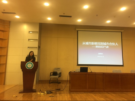 此次讲座是武汉作协开展的“百万大学生留汉创业就业计划”宣讲活动及“书香江城——全民读书月”活动之一。谢络绎是武汉成长起来的新锐作家代表,创作成绩突出,目前是湖北大学驻校作家,她从其第一部长篇小说《外省女子》延伸开来,讲述城市与自我创作关系,重点阐述了“高知新移民”、“城市新移民的社会融合层面”、“城市合伙人”等概念,并通过查阅资料,收集武汉城市合伙人政策等,让学生了解武汉多种优势,激发学生热爱武汉、留在武汉、建设武汉的热情。